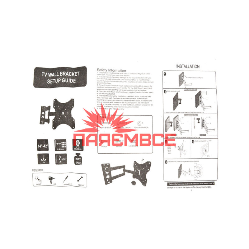 | Diagonal of screen | 14"-42" (35.56 cm-106.68 cm) - 14", 15", 15.4", 15.6", 16", 17", 18", 18.5", 19", 20", 20.7", 21", 21.5", 21.6", 22", 23", 23.6", 23.8", 24", 25", 26", 27", 27.5", 28", 28.5", 29", 30", 31", 31.5", 32", 33", 34", 35", 36", 37", 38", 38.5", 39", 39.5", 40", 40.5", 41", 42" |