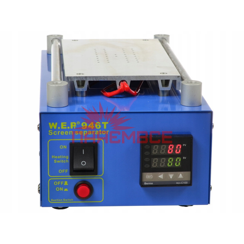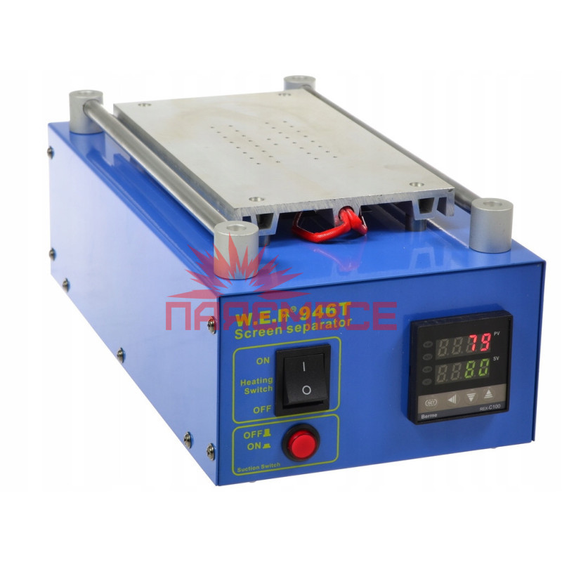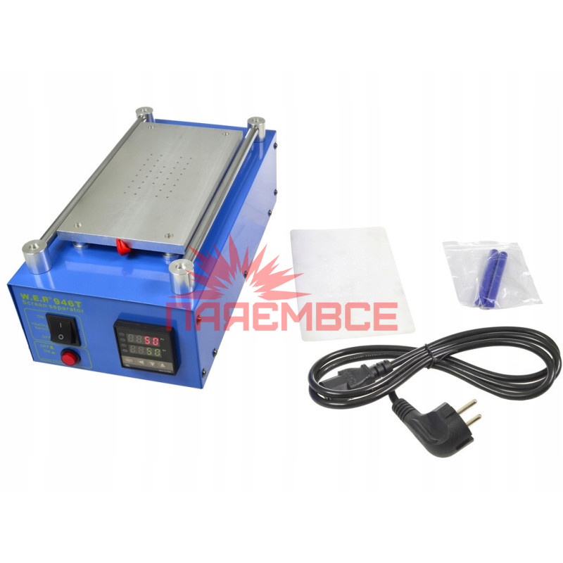 Попередній нагрівач, роздільник екрану W. E. P 946T UPGRADE дозволяє легко відокремити скло або сенсорний екран. Підтримує сенсорні екрани Samsung, HTC, LG, Iphone (4, 4s, 5) та інших телефонів. WEP 946T UPGRADE нагріває скло з дна до відповідної температури, а потім за допомогою спеціального канату, розщеплює елементи, склеєні раніше. У пристрої є нагрівальна плита розміром 110х200 мм, регулювання температури в діапазоні 0-999 градусів за Цельсієм (регулювання кожні 1 ступеня). На передній панелі ми можемо побачити задану температуру та фактичну температуру.
