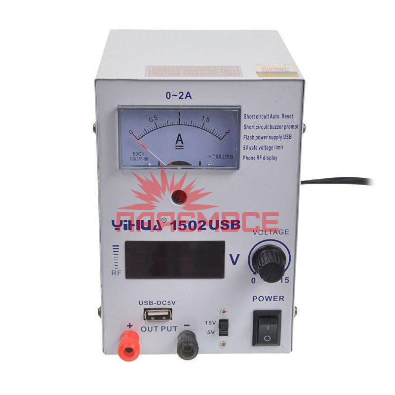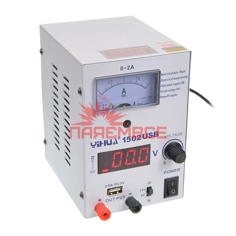 USB - джерело живлення Yihua 1502 є дуже точною джерелом живлення постійного струму з плавною напругою та регулюванням струму в усьому діапазоні. Він може працювати в режимах стабілізації напруги або автоматичного перемикання з можливістю встановлення межі струму навантаження в будь-якій точці діапазону. Блок живлення має можливість живлення пристроїв USB.