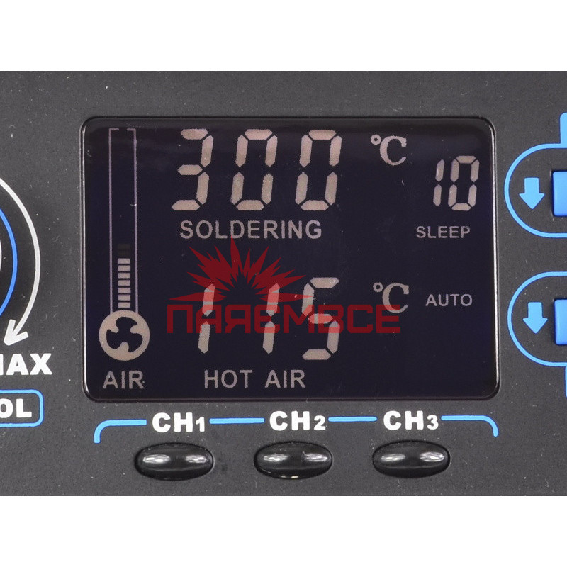 3*Пам'ять: 3 профілі програмування CH1/CH2/CH3 (фен+паяльник+потік повітря)